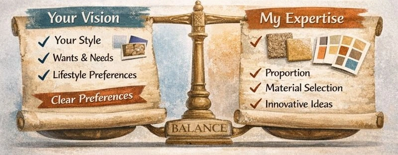 That said, being a professional designer allows me to see opportunities in proportions, materials, and combinations that you may not initially consider. The magic often happens in the balance between your preferences and my expertise.